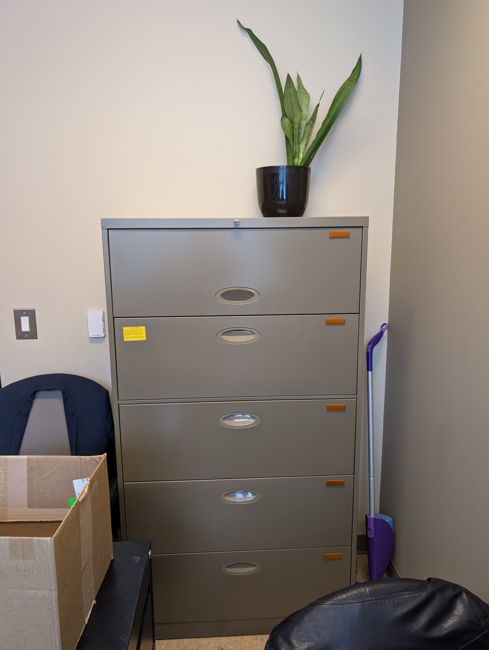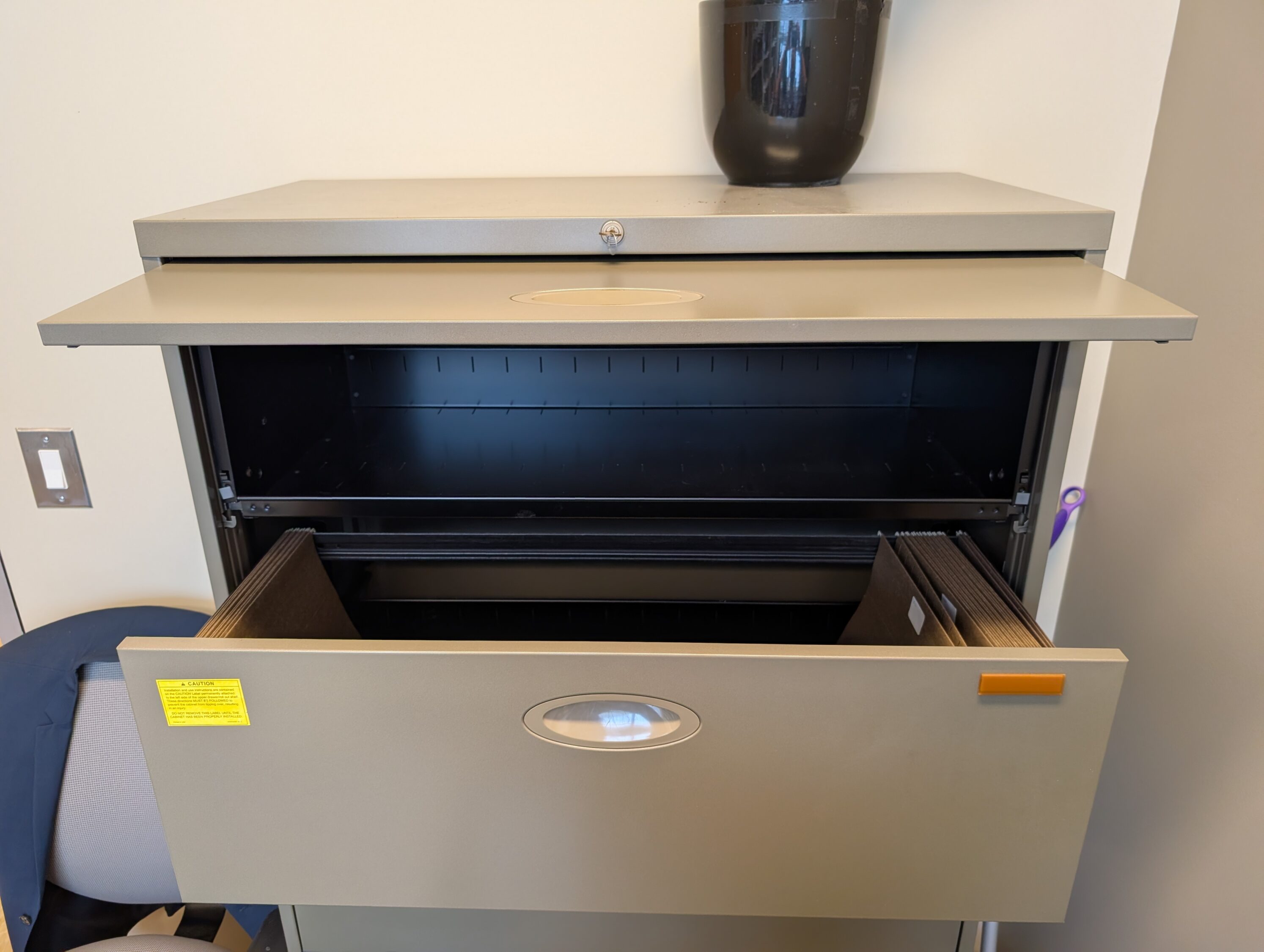 One large filing cabinet. Drawers are lockable and keys are included. Some (empty) file folders already installed.